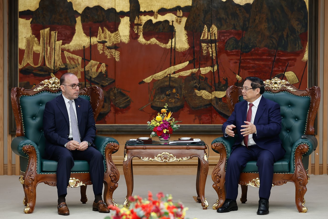 Thủ tướng đề nghị Đại sứ phối hợp chặt chẽ với phía Việt Nam khẩn trương triển khai các thỏa thuận trong cuộc điện đàm ngày 9/3 giữa Thủ tướng Phạm Minh Chính và Thủ tướng, Bộ trưởng Ngoại giao Qatar Sheikh Mohammed bin Abdulrahman bin Jasim Al-Thani, nhất là đảm bảo cung cấp khí LNG theo hợp đồng cho Việt Nam - Ảnh: VGP/Nhật Bắc